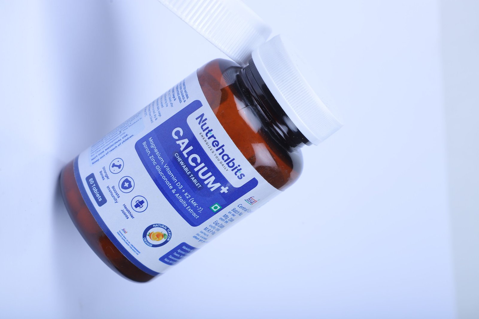 Nutrehabits Calcium+ Chewable Tablets support strong bones, healthy joints, and immunity with a powerful blend of Calcium, Magnesium, Vitamin D3, K2 (MK-7), Zinc, and Boron. A tasty orange-flavoured daily supplement for complete bone health.